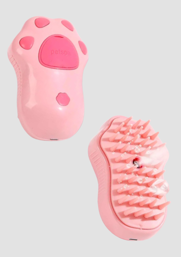 Cepillo vaporizador para perros y gatos. Con carga USB, cuenta con un compartimento para agua que a la hora del cepillado se convierte en vapor para humedecer el pelo de tu mascota manteniéndolo mas limpio, sacando el pelo suelto y mejorando la salud del pelaje de tu mascota.