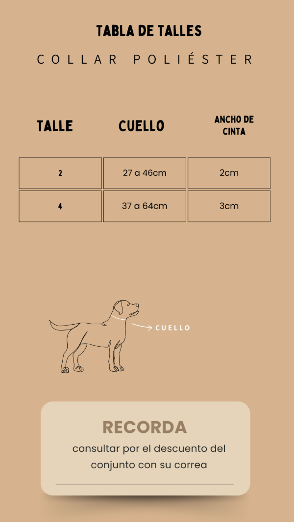 Collar confeccionado en poliéster , un material resistente, suave y muy cómodo para tu mascota. Sus aros y remaches son de acero inoxidable para asegurar su durabilidad. Con una hebilla segura y practica para abrochar.